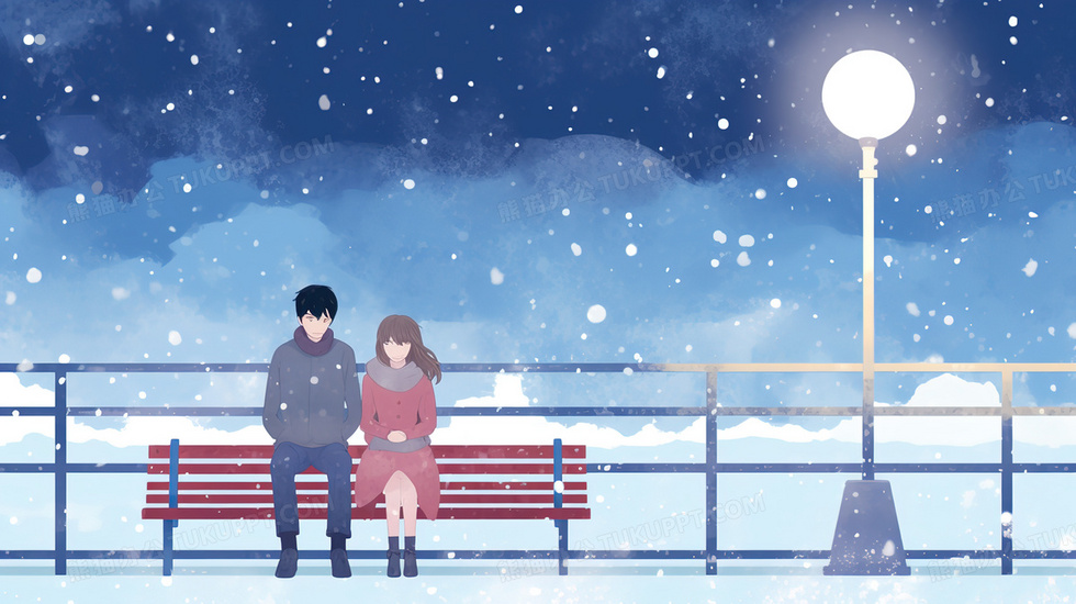 本作品内容为冬天夜晚坐在路灯下长椅的情侣插画, 格式为 jpg, 大小5 MB, 图片尺寸为2912 x 1632, 源文件无水印, 欢迎使用熊猫办公。 如认为平台内容涉嫌侵权,可通过邮件:tousu@tukuppt.com提出书面通知,我们将及时处理。