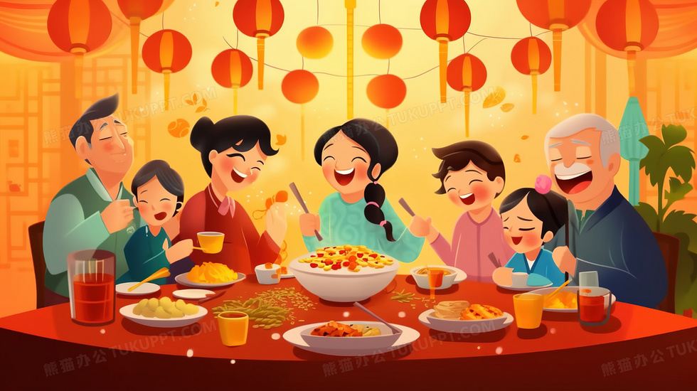 本作品内容为春节一起享用年夜饭的一家人插画, 格式为 jpg, 大小5 MB, 图片尺寸为2912 x 1632, 源文件无水印, 欢迎使用熊猫办公。 如认为平台内容涉嫌侵权,可通过邮件:tousu@tukuppt.com提出书面通知,我们将及时处理。