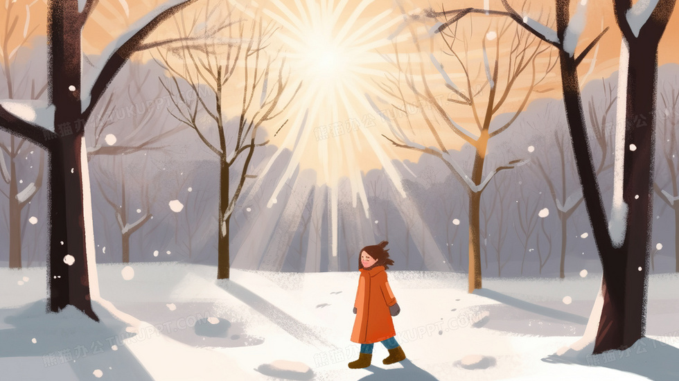 本作品内容为冬日森林里散步的女孩黄昏雪景插画, 格式为 jpg, 大小6 MB, 图片尺寸为2912 x 1632, 源文件无水印, 欢迎使用熊猫办公。 如认为平台内容涉嫌侵权,可通过邮件:tousu@tukuppt.com提出书面通知,我们将及时处理。