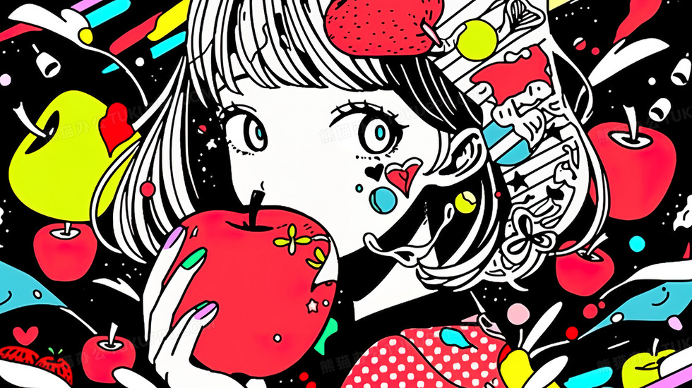 首页 > 插画 > 科技艺术 > 卡通漫画 > 彩色多巴胺吃苹果的青春女孩插画