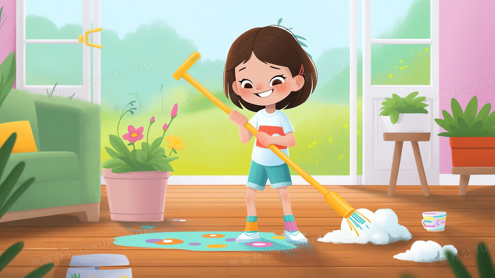 本作品内容为假期拖地板搞卫生的小女孩插画, 格式为 jpg, 大小2 MB, 图片尺寸为2912 x 1632, 源文件无水印, 欢迎使用熊猫办公。 如认为平台内容涉嫌侵权,可通过邮件:tousu@tukuppt.com提出书面通知,我们将及时处理。
