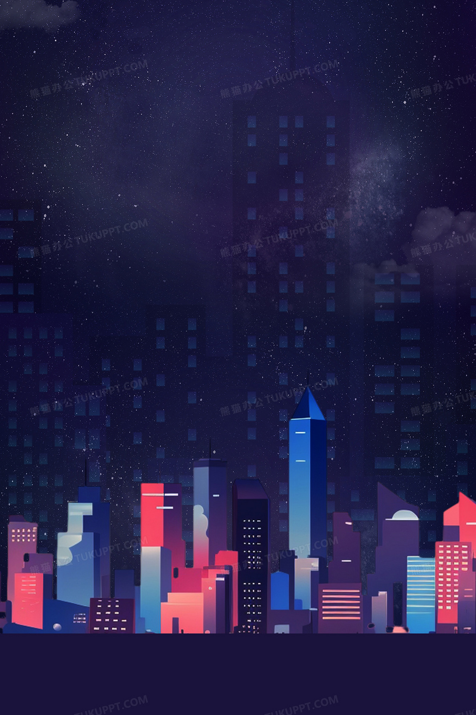 本作品内容为简约城市夜晚背景, 格式为 psd, 大小95 MB, 图片尺寸为3543 x 5315, 作品中背景图片无需修改, 源文件无水印,可以直接使用, 欢迎使用熊猫办公。 如认为平台内容涉嫌侵权,可通过邮件:tousu@tukuppt.com提出书面通知,我们将及时处理。