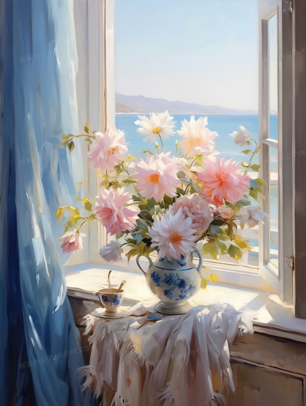 本作品内容为蓝色系窗边花瓶花朵花卉油画静物插画, 格式为 jpg, 大小6 MB, 图片尺寸为1856 x 2464, 源文件无水印, 欢迎使用熊猫办公。 如认为平台内容涉嫌侵权,可通过邮件:tousu@tukuppt.com提出书面通知,我们将及时处理。