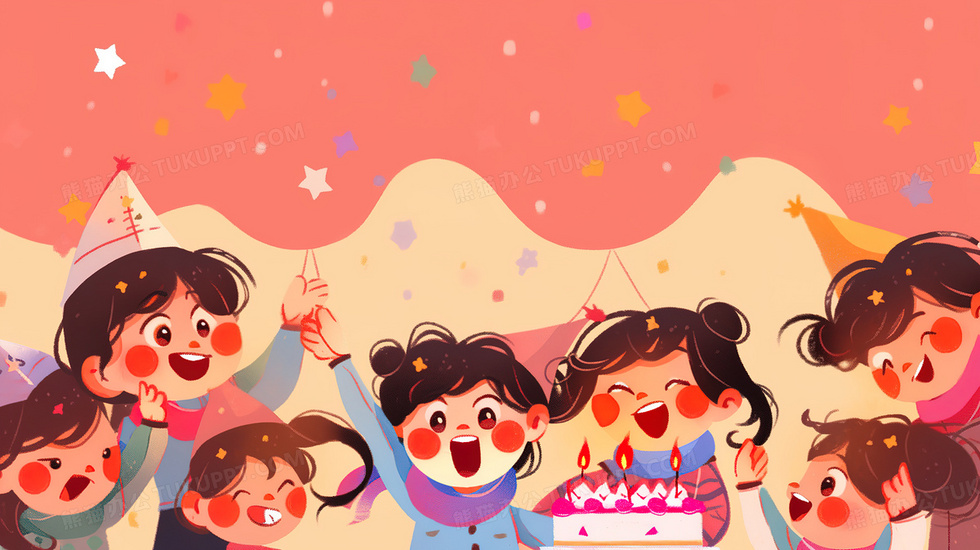 本作品内容为卡通可爱小朋友庆祝生日派对创意插画, 格式为 jpg, 大小5 MB, 图片尺寸为2912 x 1632, 源文件无水印, 欢迎使用熊猫办公。 如认为平台内容涉嫌侵权,可通过邮件:tousu@tukuppt.com提出书面通知,我们将及时处理。