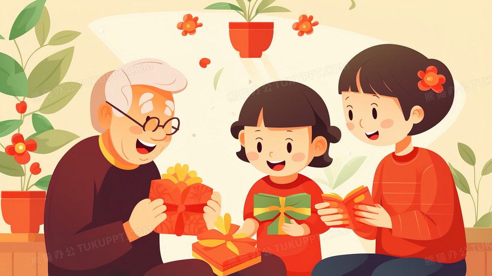 本作品内容为过年家中小孩给老人长辈送礼物温馨插画, 格式为 jpg, 大小4 MB, 图片尺寸为2912 x 1632, 源文件无水印, 欢迎使用熊猫办公。 如认为平台内容涉嫌侵权,可通过邮件:tousu@tukuppt.com提出书面通知,我们将及时处理。