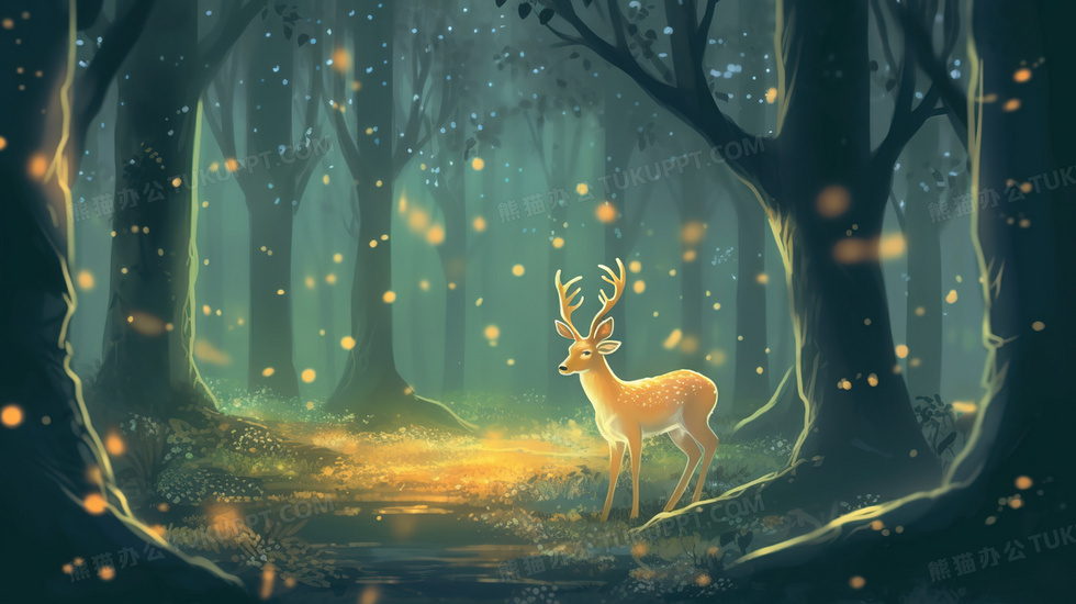 本作品内容为卡通唯美森林中的麋鹿插画, 格式为 jpg, 大小4 MB, 图片尺寸为2912 x 1632, 源文件无水印, 欢迎使用熊猫办公。 如认为平台内容涉嫌侵权,可通过邮件:tousu@tukuppt.com提出书面通知,我们将及时处理。
