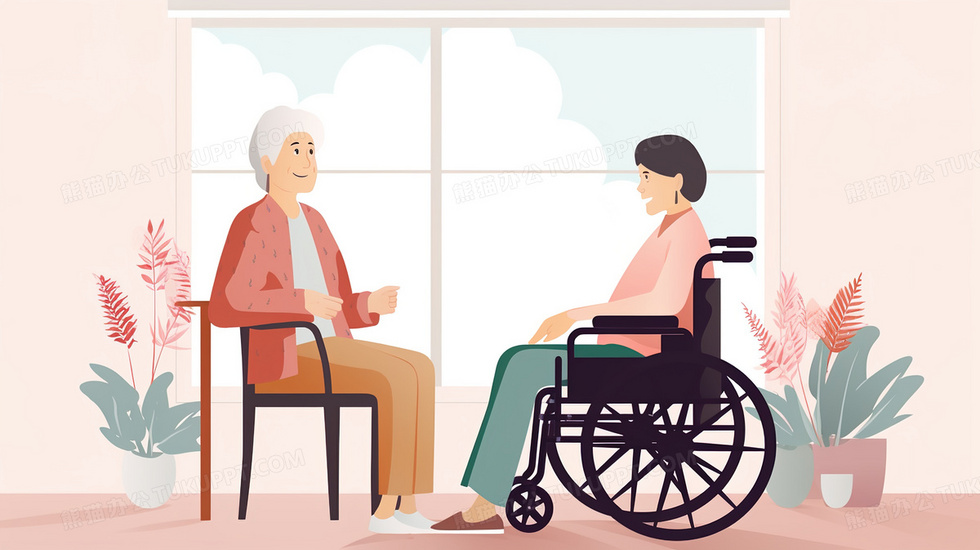 本作品内容为陪伴坐轮椅的老人谈心温馨插画, 格式为 jpg, 大小4 MB, 图片尺寸为2912 x 1632, 源文件无水印, 欢迎使用熊猫办公。 如认为平台内容涉嫌侵权,可通过邮件:tousu@tukuppt.com提出书面通知,我们将及时处理。