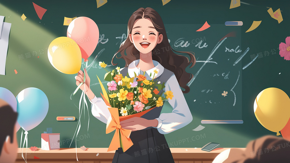 本作品内容为美丽的女老师抱着鲜花在黑板前开心的笑教师节创意插画, 格式为 jpg, 大小5 MB, 图片尺寸为2912 x 1632, 源文件无水印, 欢迎使用熊猫办公。 如认为平台内容涉嫌侵权,可通过邮件:tousu@tukuppt.com提出书面通知,我们将及时处理。