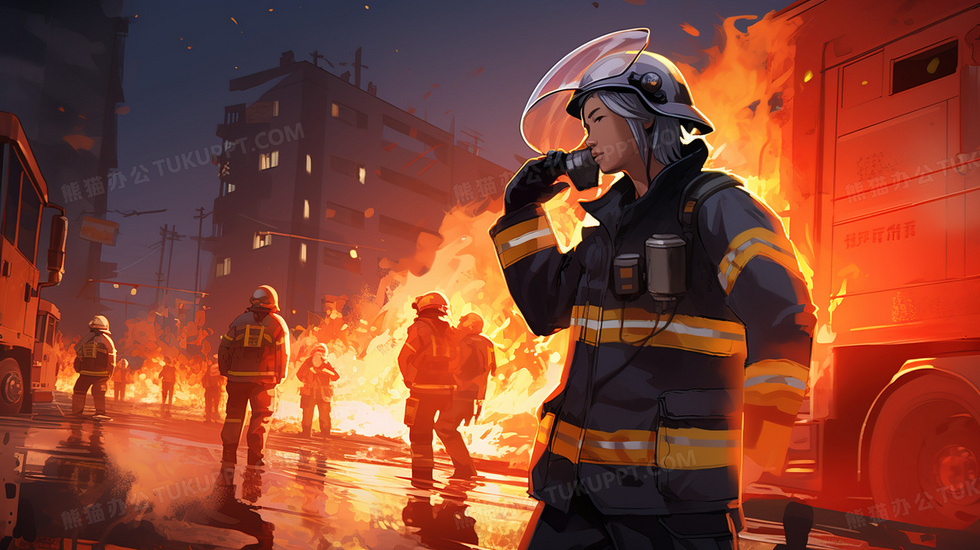 本作品内容为火灾现场逆行灭火的救援队员插画, 格式为 jpg, 大小5 MB, 图片尺寸为2912 x 1632, 源文件无水印, 欢迎使用熊猫办公。 如认为平台内容涉嫌侵权,可通过邮件:tousu@tukuppt.com提出书面通知,我们将及时处理。