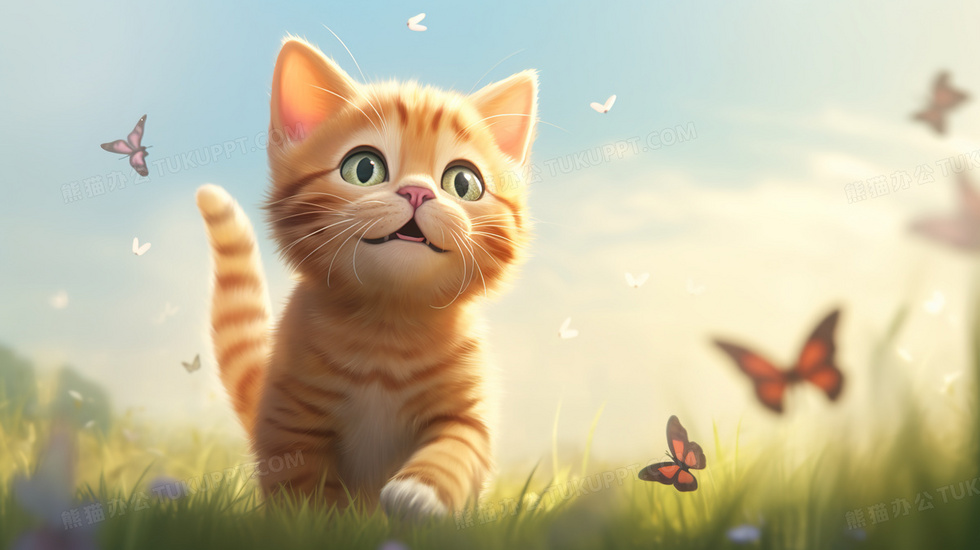 本作品内容为春天绿色草地上被蝴蝶围绕可爱小猫咪插画, 格式为 jpg, 大小4 MB, 图片尺寸为2912 x 1632, 源文件无水印, 欢迎使用熊猫办公。 如认为平台内容涉嫌侵权,可通过邮件:tousu@tukuppt.com提出书面通知,我们将及时处理。