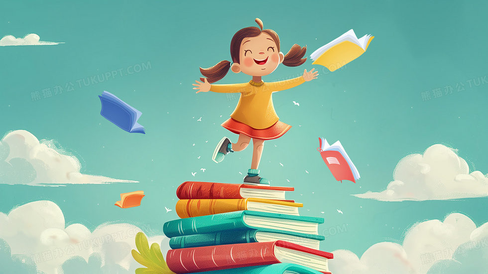 本作品内容为小女孩踩着一摞书创意教育插画, 格式为 jpg, 大小5 MB, 图片尺寸为2912 x 1632, 源文件无水印, 欢迎使用熊猫办公。 如认为平台内容涉嫌侵权,可通过邮件:tousu@tukuppt.com提出书面通知,我们将及时处理。