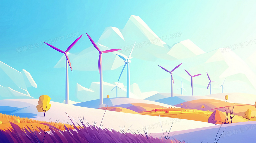 本作品内容为扁平化新能源电力风车环保背景, 格式为 jpg, 大小2 MB, 图片尺寸为2912 x 1632, 作品中背景图片无需修改, 源文件无水印,可以直接使用, 欢迎使用熊猫办公。 如认为平台内容涉嫌侵权,可通过邮件:tousu@tukuppt.com提出书面通知,我们将及时处理。