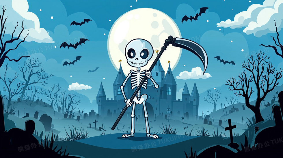 本作品内容为夜晚古堡手拿斧头的骷髅人插画, 格式为 jpg, 大小2 MB, 图片尺寸为2912 x 1632, 源文件无水印, 欢迎使用熊猫办公。 如认为平台内容涉嫌侵权,可通过邮件:tousu@tukuppt.com提出书面通知,我们将及时处理。