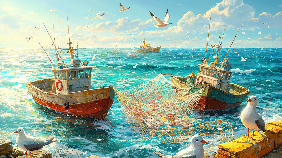 本作品内容为海上轮渡撒网捕鱼创意插画, 格式为 jpg, 大小4 MB, 图片尺寸为2912 x 1632, 源文件无水印, 欢迎使用熊猫办公。 如认为平台内容涉嫌侵权,可通过邮件:tousu@tukuppt.com提出书面通知,我们将及时处理。