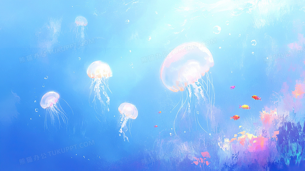 本作品内容为卡通风海底的水母背景, 格式为 jpg, 大小3 MB, 图片尺寸为2912 x 1632, 作品中背景图片无需修改, 源文件无水印,可以直接使用, 欢迎使用熊猫办公。 如认为平台内容涉嫌侵权,可通过邮件:tousu@tukuppt.com提出书面通知,我们将及时处理。