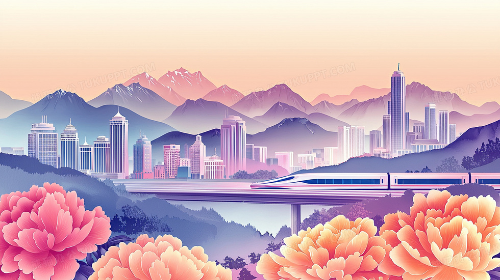 本作品内容为现代城市建筑高铁牡丹花插画, 格式为 jpg, 大小3 MB, 图片尺寸为2912 x 1632, 源文件无水印, 欢迎使用熊猫办公。 如认为平台内容涉嫌侵权,可通过邮件:tousu@tukuppt.com提出书面通知,我们将及时处理。
