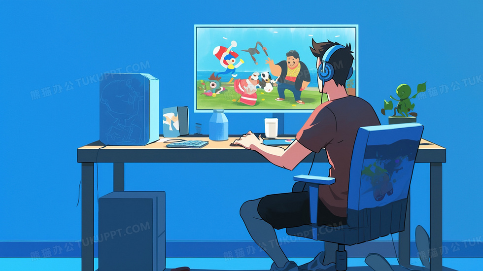 本作品内容为戴着耳机电脑前打游戏卡通男子插画, 格式为 jpg, 大小3 MB, 图片尺寸为2912 x 1632, 源文件无水印, 欢迎使用熊猫办公。 如认为平台内容涉嫌侵权,可通过邮件:tousu@tukuppt.com提出书面通知,我们将及时处理。