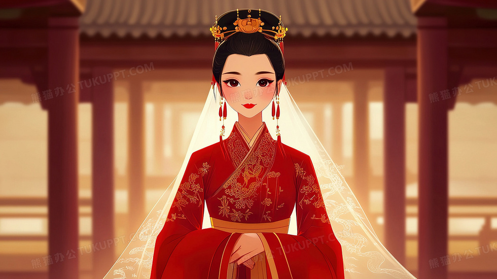 本作品内容为中式婚礼新娘红色喜庆装扮插画, 格式为 jpg, 大小3 MB, 图片尺寸为2912 x 1632, 源文件无水印, 欢迎使用熊猫办公。 如认为平台内容涉嫌侵权,可通过邮件:tousu@tukuppt.com提出书面通知,我们将及时处理。