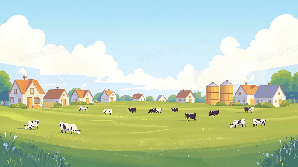 本作品内容为绿色辽阔草原牧场放养奶牛建筑插画, 格式为 jpg, 大小2 MB, 图片尺寸为2912 x 1632, 源文件无水印, 欢迎使用熊猫办公。 如认为平台内容涉嫌侵权,可通过邮件:tousu@tukuppt.com提出书面通知,我们将及时处理。