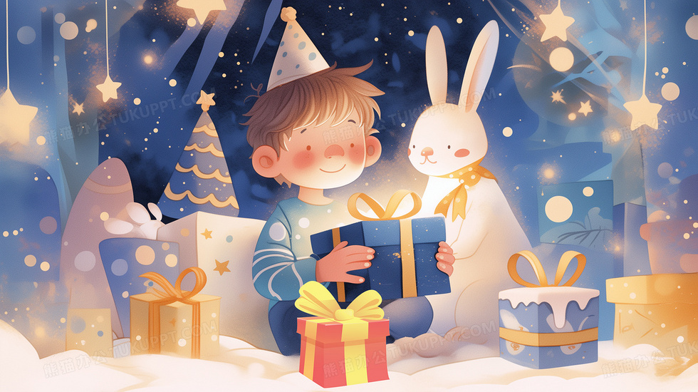 本作品内容为拟人化的小兔子陪小男孩拆生日礼物插画, 格式为 jpg, 大小8 MB, 图片尺寸为2912 x 1632, 源文件无水印, 欢迎使用熊猫办公。 如认为平台内容涉嫌侵权,可通过邮件:tousu@tukuppt.com提出书面通知,我们将及时处理。