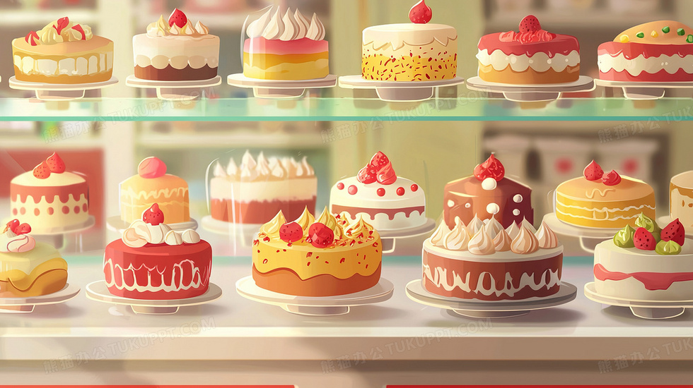 本作品内容为橱窗展示各式各样的蛋糕插画, 格式为 jpg, 大小3 MB, 图片尺寸为2912 x 1632, 源文件无水印, 欢迎使用熊猫办公。 如认为平台内容涉嫌侵权,可通过邮件:tousu@tukuppt.com提出书面通知,我们将及时处理。