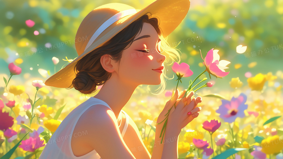 本作品内容为闻花香的美女治愈系唯美插画, 格式为 jpg, 大小3 MB, 图片尺寸为2912 x 1632, 源文件无水印, 欢迎使用熊猫办公。 如认为平台内容涉嫌侵权,可通过邮件:tousu@tukuppt.com提出书面通知,我们将及时处理。