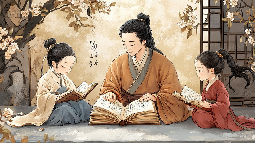 本作品内容为古代教育老师教学生读书学习插画, 格式为 jpg, 大小4 MB, 图片尺寸为2912 x 1632, 源文件无水印, 欢迎使用熊猫办公。 如认为平台内容涉嫌侵权,可通过邮件:tousu@tukuppt.com提出书面通知,我们将及时处理。