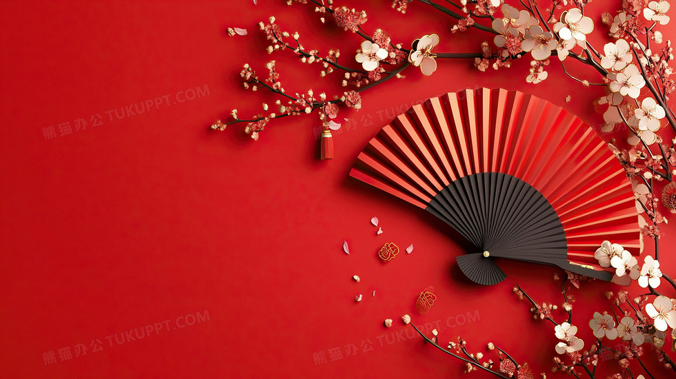 本作品内容为红色扇子新年喜庆背景, 格式为 jpg, 大小3 MB, 图片尺寸为2912 x 1632, 作品中背景图片无需修改, 源文件无水印,可以直接使用, 欢迎使用熊猫办公。 如认为平台内容涉嫌侵权,可通过邮件:tousu@tukuppt.com提出书面通知,我们将及时处理。