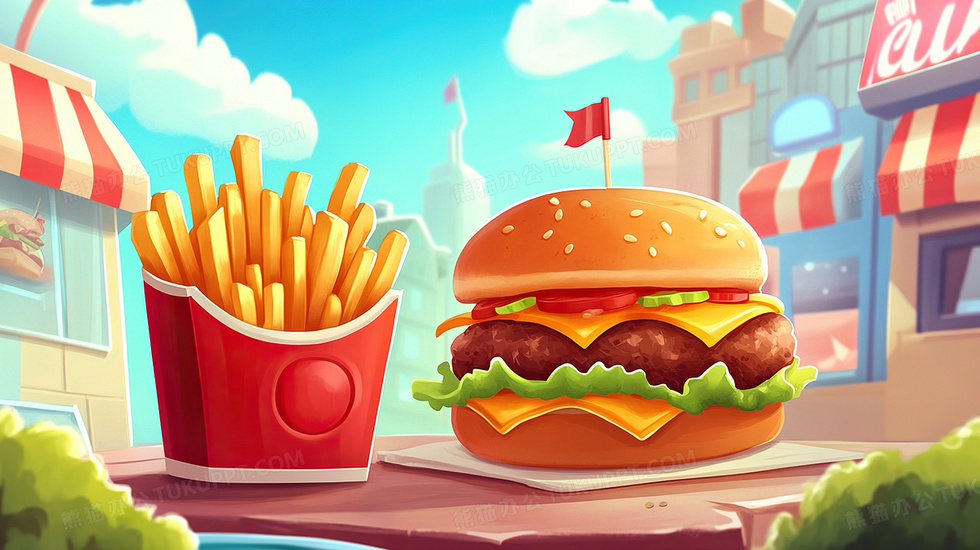 本作品内容为汉堡薯条快餐食物膨化食品插画, 格式为 jpg, 大小3 MB, 图片尺寸为2912 x 1632, 源文件无水印, 欢迎使用熊猫办公。 如认为平台内容涉嫌侵权,可通过邮件:tousu@tukuppt.com提出书面通知,我们将及时处理。