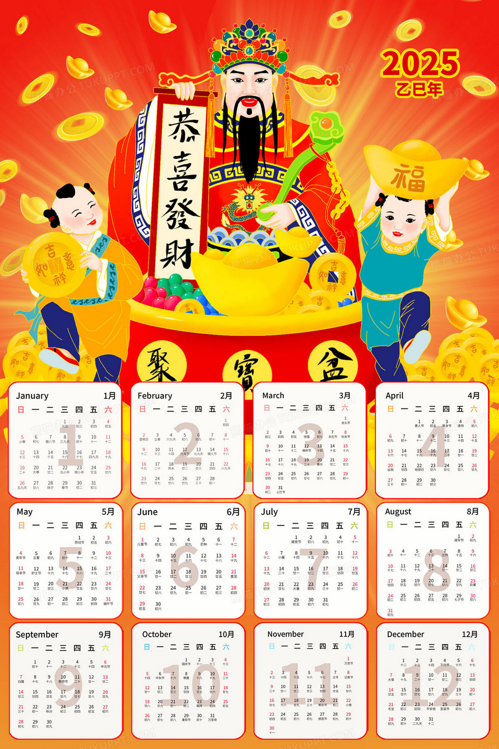 本作品内容为2025乙巳年财神来恭喜发财聚宝盆年历竖版插画, 格式为 psd, 大小48 MB, 请使用软件PhotoShop(CS6)打开, 源文件无水印, 欢迎使用熊猫办公。 如认为平台内容涉嫌侵权,可通过邮件:tousu@tukuppt.com提出书面通知,我们将及时处理。