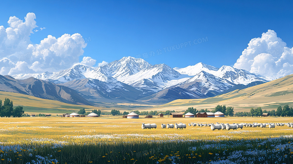 本作品内容为手绘风格草原牧场背景, 格式为 jpg, 大小4 MB, 图片尺寸为2912 x 1632, 作品中背景图片无需修改, 源文件无水印,可以直接使用, 欢迎使用熊猫办公。 如认为平台内容涉嫌侵权,可通过邮件:tousu@tukuppt.com提出书面通知,我们将及时处理。