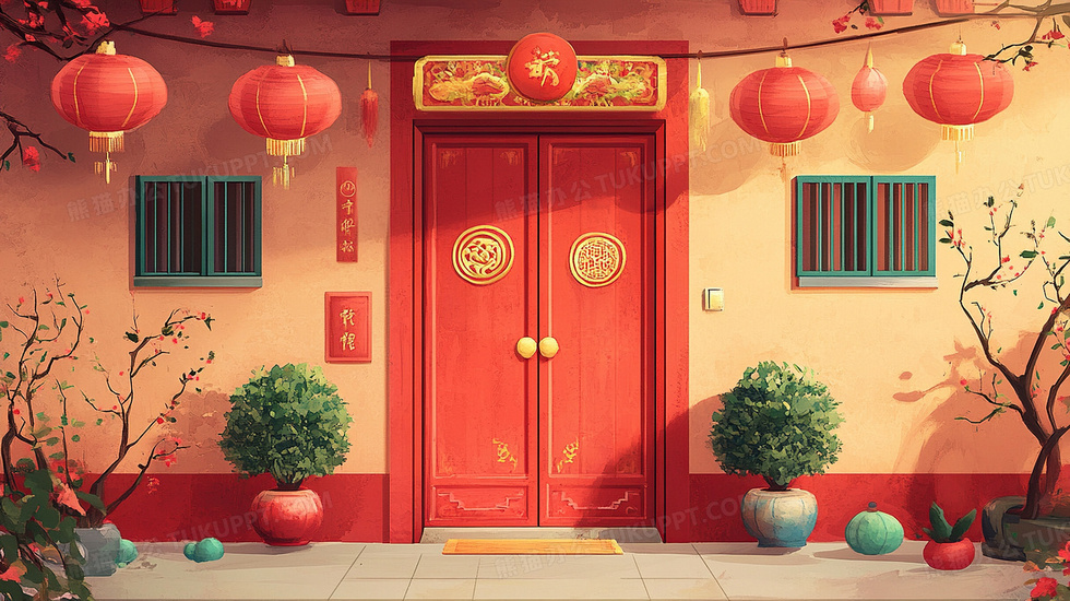 本作品内容为喜庆新年春节家门口红灯笼装饰插画, 格式为 jpg, 大小4 MB, 图片尺寸为2912 x 1632, 源文件无水印, 欢迎使用熊猫办公。 如认为平台内容涉嫌侵权,可通过邮件:tousu@tukuppt.com提出书面通知,我们将及时处理。