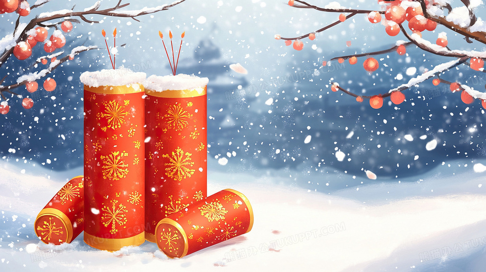 本作品内容为喜庆新年雪地里的炮竹插画, 格式为 jpg, 大小3 MB, 图片尺寸为2912 x 1632, 源文件无水印, 欢迎使用熊猫办公。 如认为平台内容涉嫌侵权,可通过邮件:tousu@tukuppt.com提出书面通知,我们将及时处理。