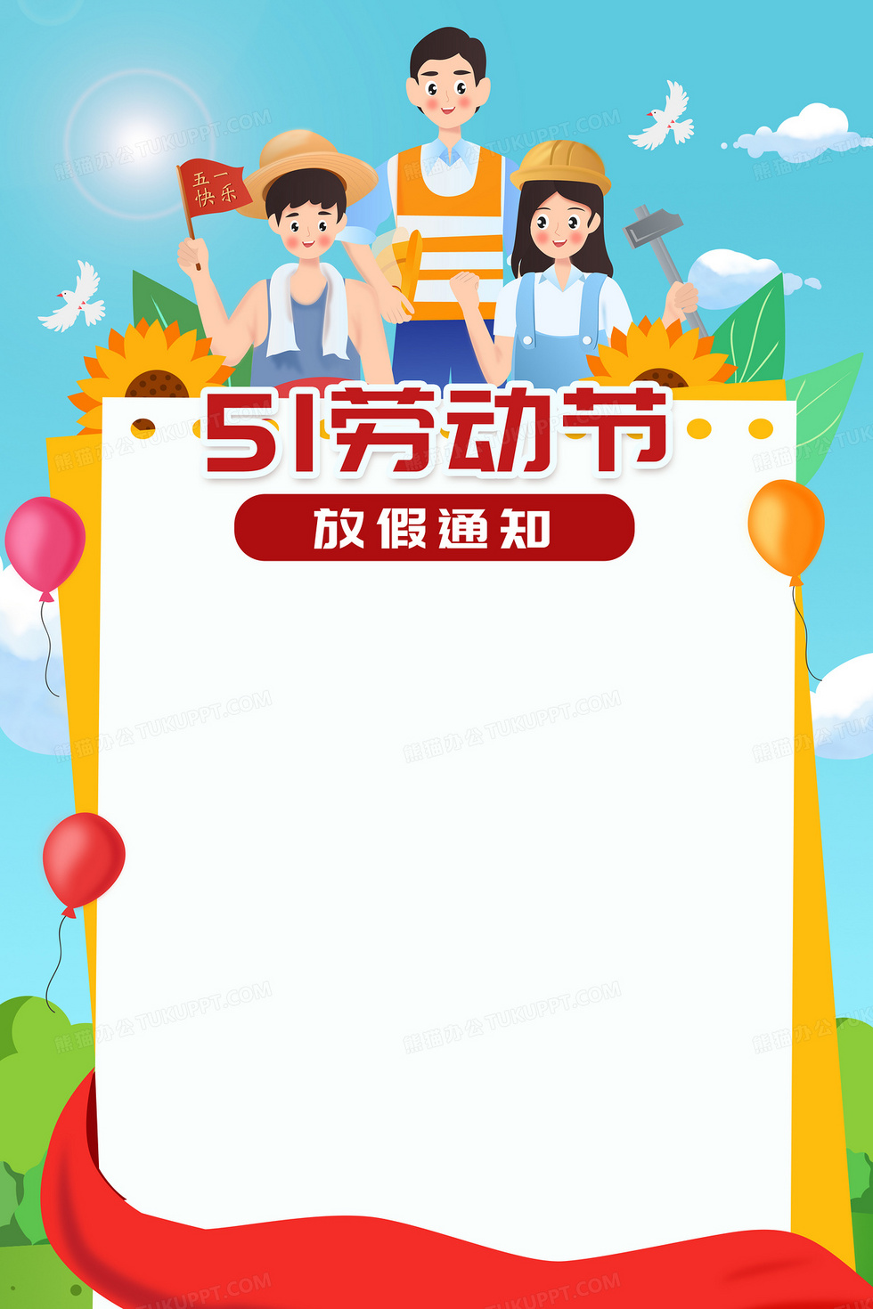 本作品内容为五一劳动节蓝天白云放假通知背景, 格式为 psd, 大小25 MB, 图片尺寸为3543 x 5315, 作品中背景图片无需修改, 源文件无水印,可以直接使用, 欢迎使用熊猫办公。 如认为平台内容涉嫌侵权,可通过邮件:tousu@tukuppt.com提出书面通知,我们将及时处理。