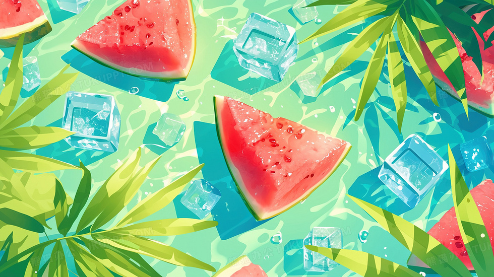 本作品内容为夏日清凉西瓜冰块插画, 格式为 jpg, 大小3 MB, 图片尺寸为2912 x 1632, 源文件无水印, 欢迎使用熊猫办公。 如认为平台内容涉嫌侵权,可通过邮件:tousu@tukuppt.com提出书面通知,我们将及时处理。