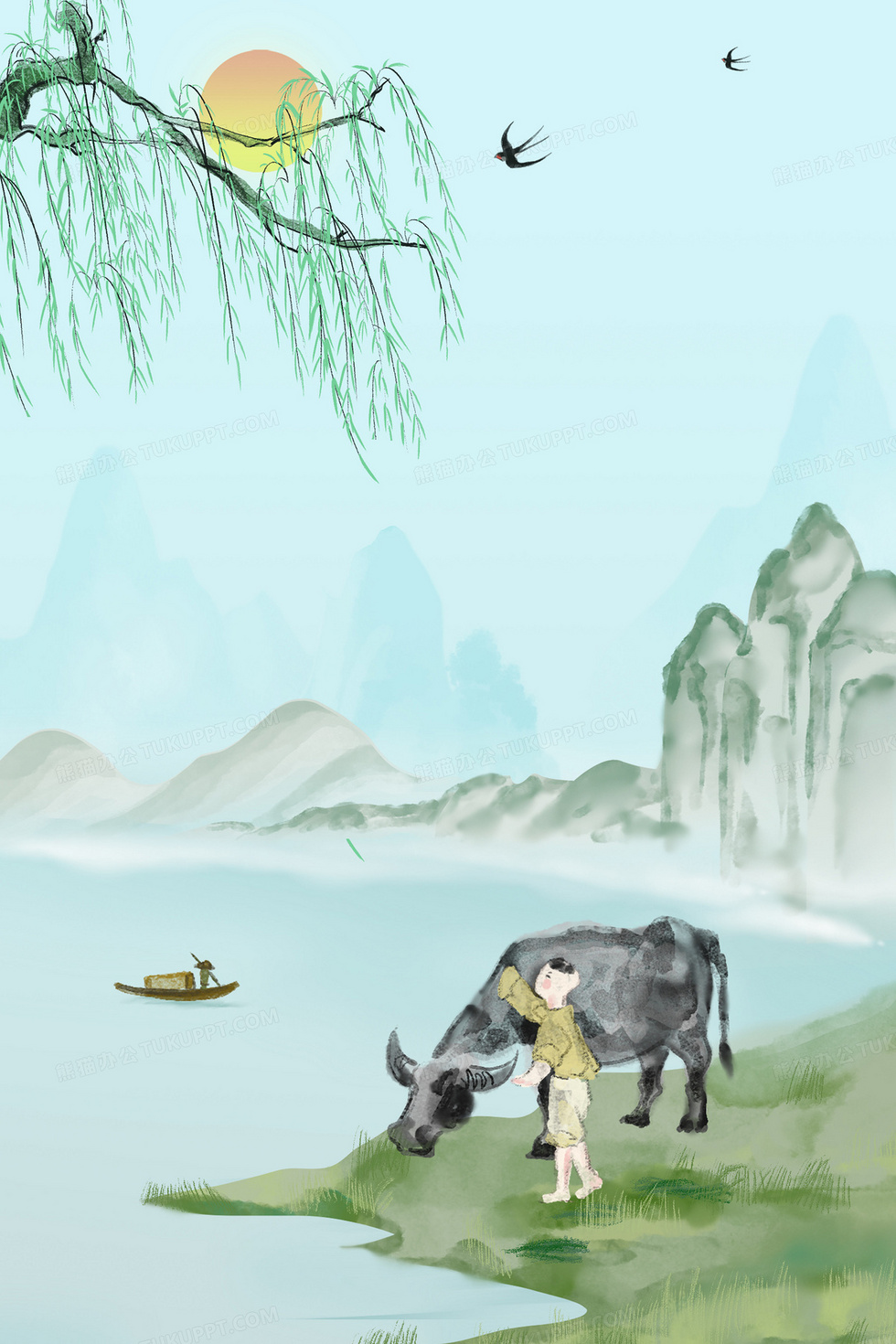 本作品内容为水墨风牧童老牛背景, 格式为 psd, 大小60 MB, 图片尺寸为3543 x 5315, 作品中背景图片无需修改, 源文件无水印,可以直接使用, 欢迎使用熊猫办公。 如认为平台内容涉嫌侵权,可通过邮件:tousu@tukuppt.com提出书面通知,我们将及时处理。