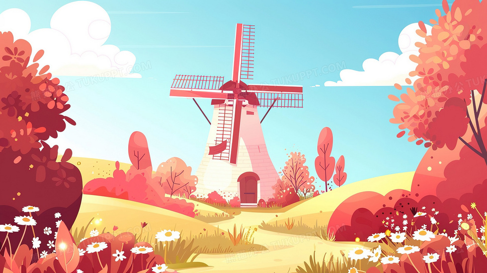 草地上的风车房屋唯美插画