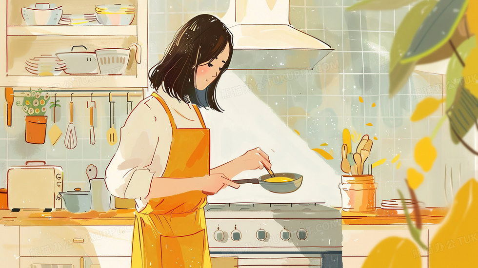 本作品内容为一个女生在厨房里烹调美食插画, 格式为 jpg, 大小3 MB, 图片尺寸为2912 x 1632, 源文件无水印, 欢迎使用熊猫办公。 如认为平台内容涉嫌侵权,可通过邮件:tousu@tukuppt.com提出书面通知,我们将及时处理。