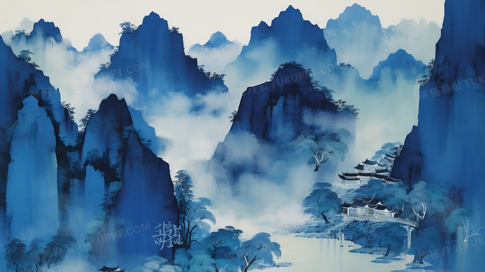 本作品内容为蓝色层层叠叠的山峰水墨画, 格式为 jpg, 大小3 MB, 图片尺寸为2912 x 1632, 源文件无水印, 欢迎使用熊猫办公。 如认为平台内容涉嫌侵权,可通过邮件:tousu@tukuppt.com提出书面通知,我们将及时处理。