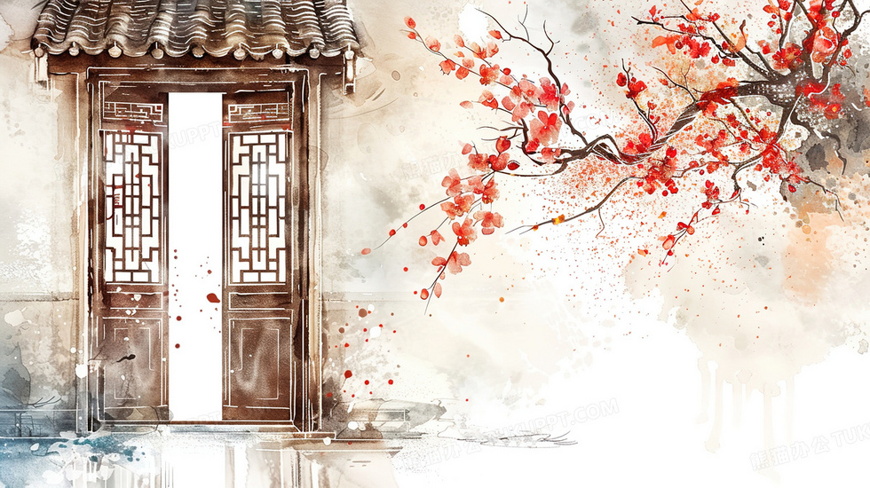 本作品内容为中国古建筑木制门旁开花的树插画, 格式为 jpg, 大小3 MB, 图片尺寸为2912 x 1632, 源文件无水印, 欢迎使用熊猫办公。 如认为平台内容涉嫌侵权,可通过邮件:tousu@tukuppt.com提出书面通知,我们将及时处理。