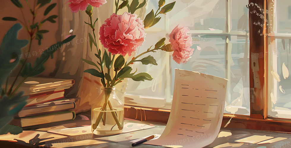 本作品内容为窗边桌上的花朵康乃馨插画, 格式为 jpg, 大小4 MB, 图片尺寸为2912 x 1486, 源文件无水印, 欢迎使用熊猫办公。 如认为平台内容涉嫌侵权,可通过邮件:tousu@tukuppt.com提出书面通知,我们将及时处理。