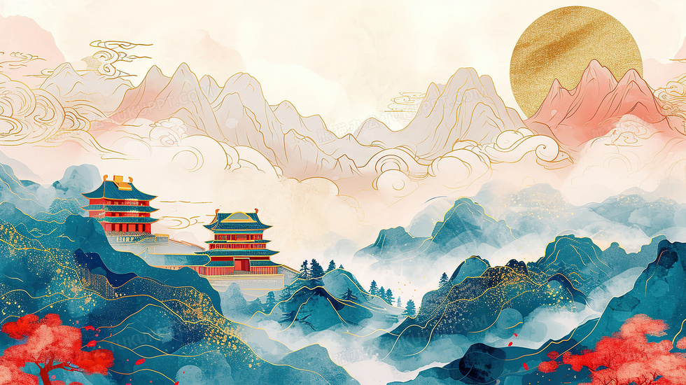 本作品内容为彩色唯美国潮鎏金建筑插画, 格式为 jpg, 大小4 MB, 图片尺寸为2912 x 1632, 源文件无水印, 欢迎使用熊猫办公。 如认为平台内容涉嫌侵权,可通过邮件:tousu@tukuppt.com提出书面通知,我们将及时处理。