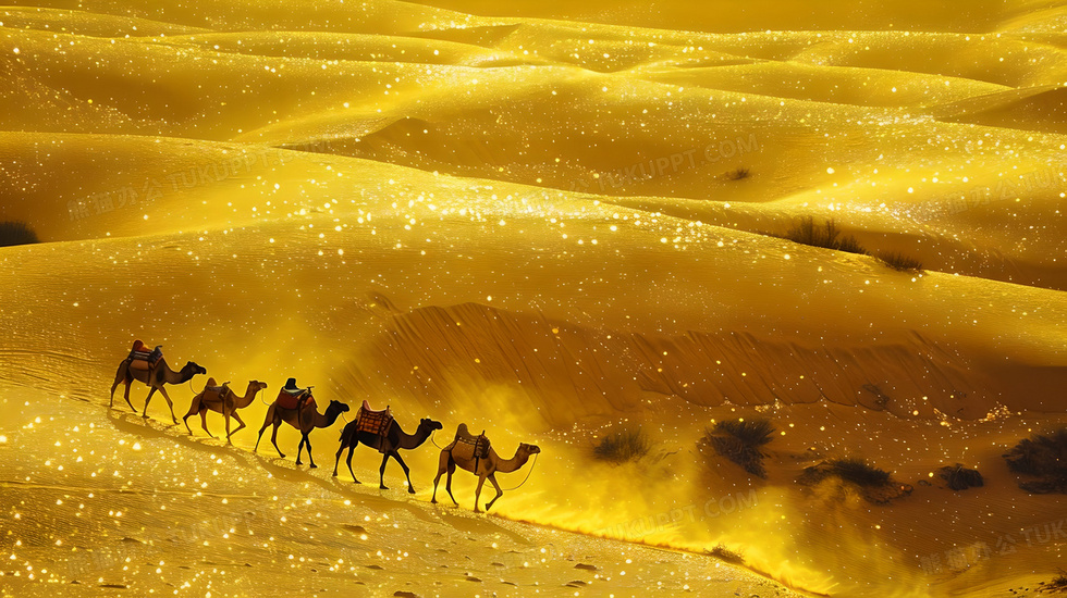 本作品内容为骆驼排成一行缓慢行进在色彩斑斓的黄色闪闪发光的沙漠中背景, 格式为 jpg, 大小4 MB, 图片尺寸为2912 x 1632, 作品中背景图片无需修改, 源文件无水印,可以直接使用, 欢迎使用熊猫办公。 如认为平台内容涉嫌侵权,可通过邮件:tousu@tukuppt.com提出书面通知,我们将及时处理。