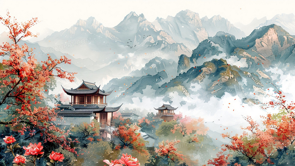 本作品内容为中国古风山水风景插画, 格式为 jpg, 大小3 MB, 图片尺寸为2240 x 1256, 源文件无水印, 欢迎使用熊猫办公。 如认为平台内容涉嫌侵权,可通过邮件:tousu@tukuppt.com提出书面通知,我们将及时处理。