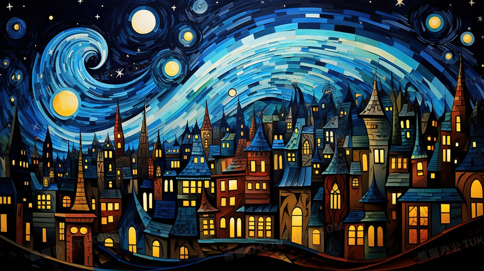 本作品内容为山城的夜景梵高画风插画, 格式为 jpg, 大小3 MB, 图片尺寸为2912 x 1632, 源文件无水印, 欢迎使用熊猫办公。 如认为平台内容涉嫌侵权,可通过邮件:tousu@tukuppt.com提出书面通知,我们将及时处理。