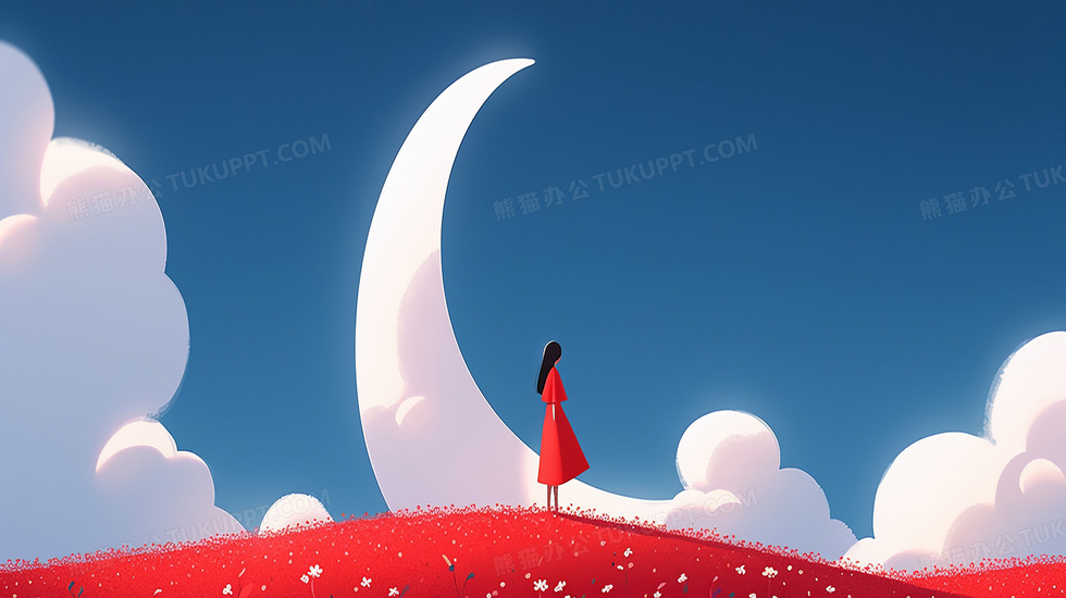 本作品内容为白云间一个穿红色裙子的可爱的女生站在月亮旁边的红色花瓣上插画, 格式为 jpg, 大小2 MB, 图片尺寸为2912 x 1632, 源文件无水印, 欢迎使用熊猫办公。 如认为平台内容涉嫌侵权,可通过邮件:tousu@tukuppt.com提出书面通知,我们将及时处理。