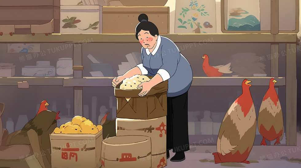 本作品内容为鸡养殖场里工作的中年妇女插画, 格式为 jpg, 大小2 MB, 图片尺寸为2912 x 1632, 源文件无水印, 欢迎使用熊猫办公。 如认为平台内容涉嫌侵权,可通过邮件:tousu@tukuppt.com提出书面通知,我们将及时处理。