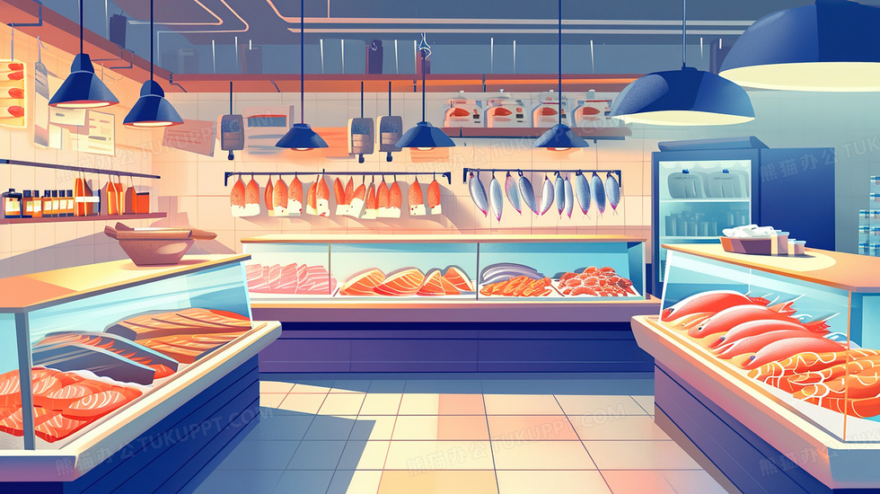 本作品内容为海鲜肉类商铺场景插画, 格式为 jpg, 大小3 MB, 图片尺寸为2912 x 1632, 源文件无水印, 欢迎使用熊猫办公。 如认为平台内容涉嫌侵权,可通过邮件:tousu@tukuppt.com提出书面通知,我们将及时处理。