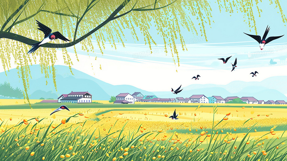 本作品内容为春季乡村田野风景插画, 格式为 jpg, 大小4 MB, 图片尺寸为2912 x 1632, 源文件无水印, 欢迎使用熊猫办公。 如认为平台内容涉嫌侵权,可通过邮件:tousu@tukuppt.com提出书面通知,我们将及时处理。