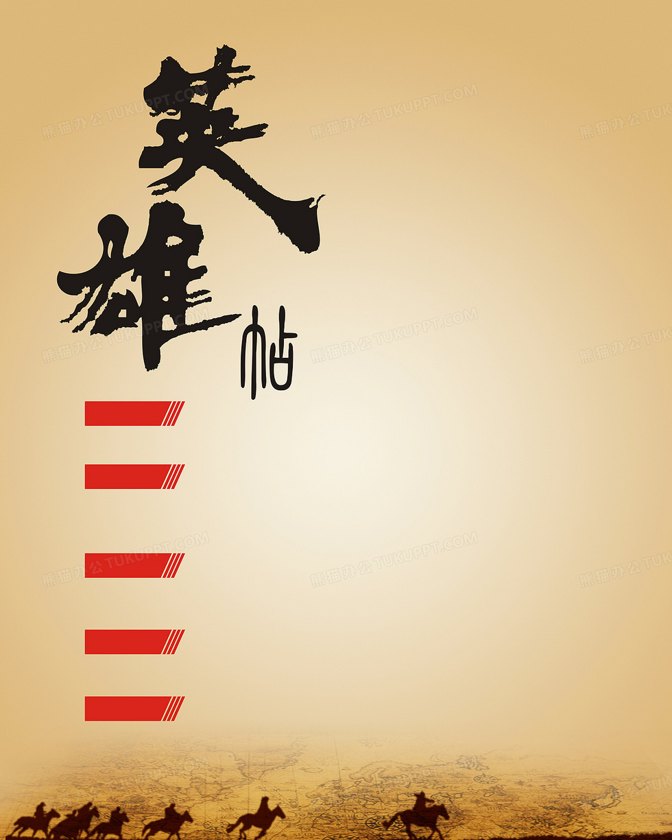 本作品内容为复古万马奔腾英雄帖招聘宣传单背景, 格式为 psd, 图片尺寸为9448 x 11811, 作品中背景图片无需修改, 源文件无水印,可以直接使用, 欢迎使用熊猫办公。 如认为平台内容涉嫌侵权,可通过邮件:tousu@tukuppt.com提出书面通知,我们将及时处理。